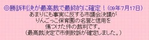 おや? りんごっこ保育園グループのホームページが7月24日付で更新され、次のようなお知らせが登場しました。 ◎勝訴判決が最高裁で最終的に確定!(09年7月17日) あまりにも事実に反する市議会決議が りんごっこ保育園の名誉と信用を 傷つけた件の裁判…