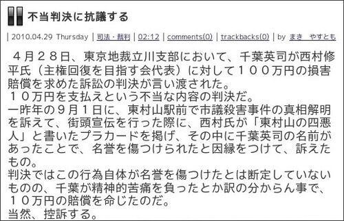 引き続き、街宣名誉毀損裁判で西村修平が千葉英司さんに敗訴したという話題です。判決言い渡しの場で「ずっと何かに挑むような表情をしていた」(エアフォース)というまきやすとも(槇泰智)が、次のような記事をアップしました(改行は適宜修正、以下同)…